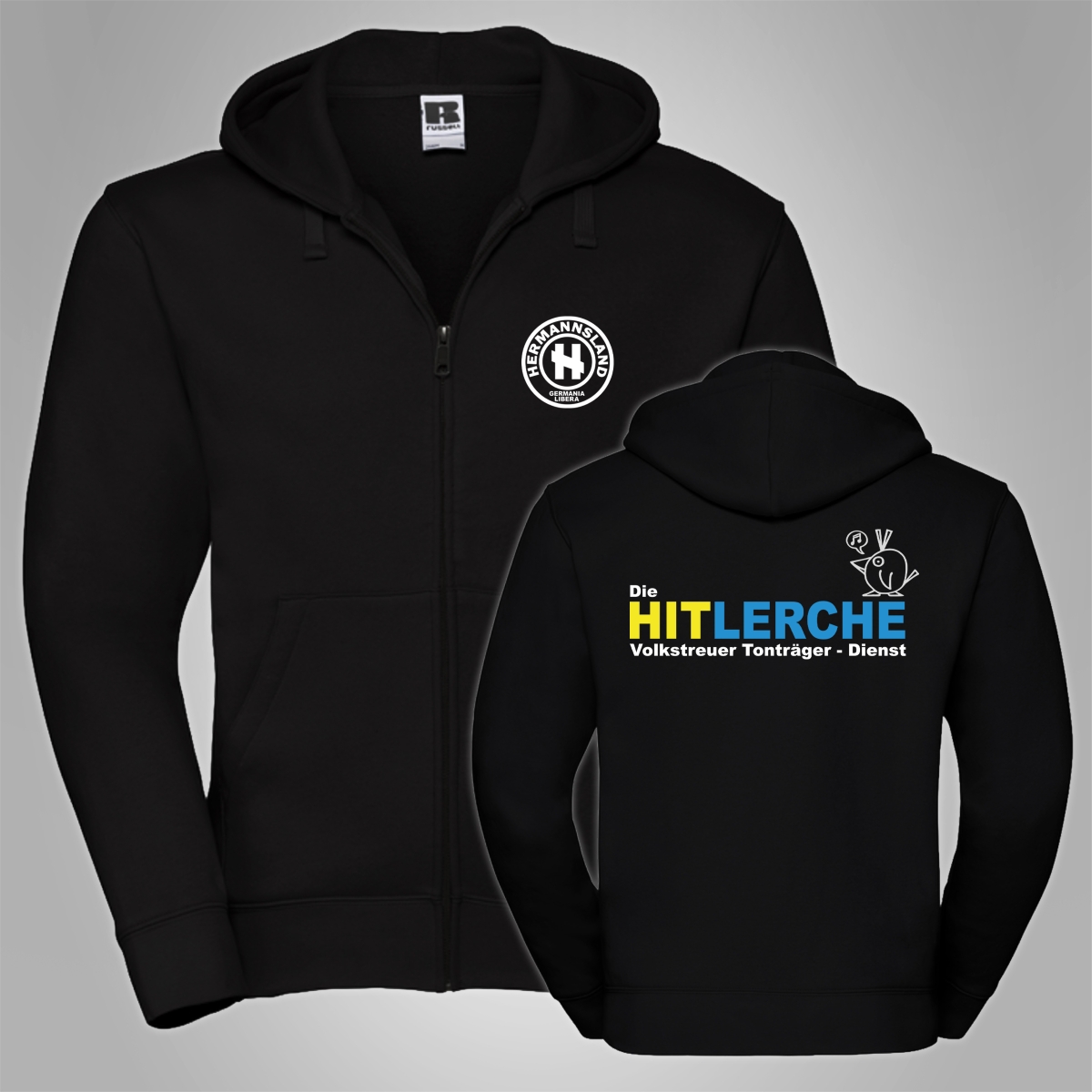 Sweatjacke mit Kapuze und Kängurutasche. Kommt mit kleinem Brust und großem Rückendruck
