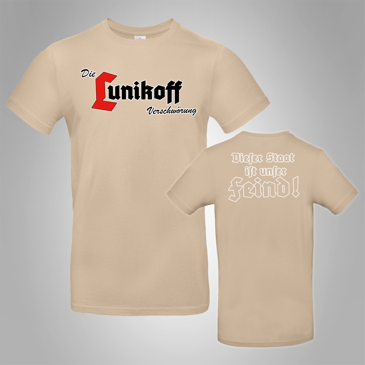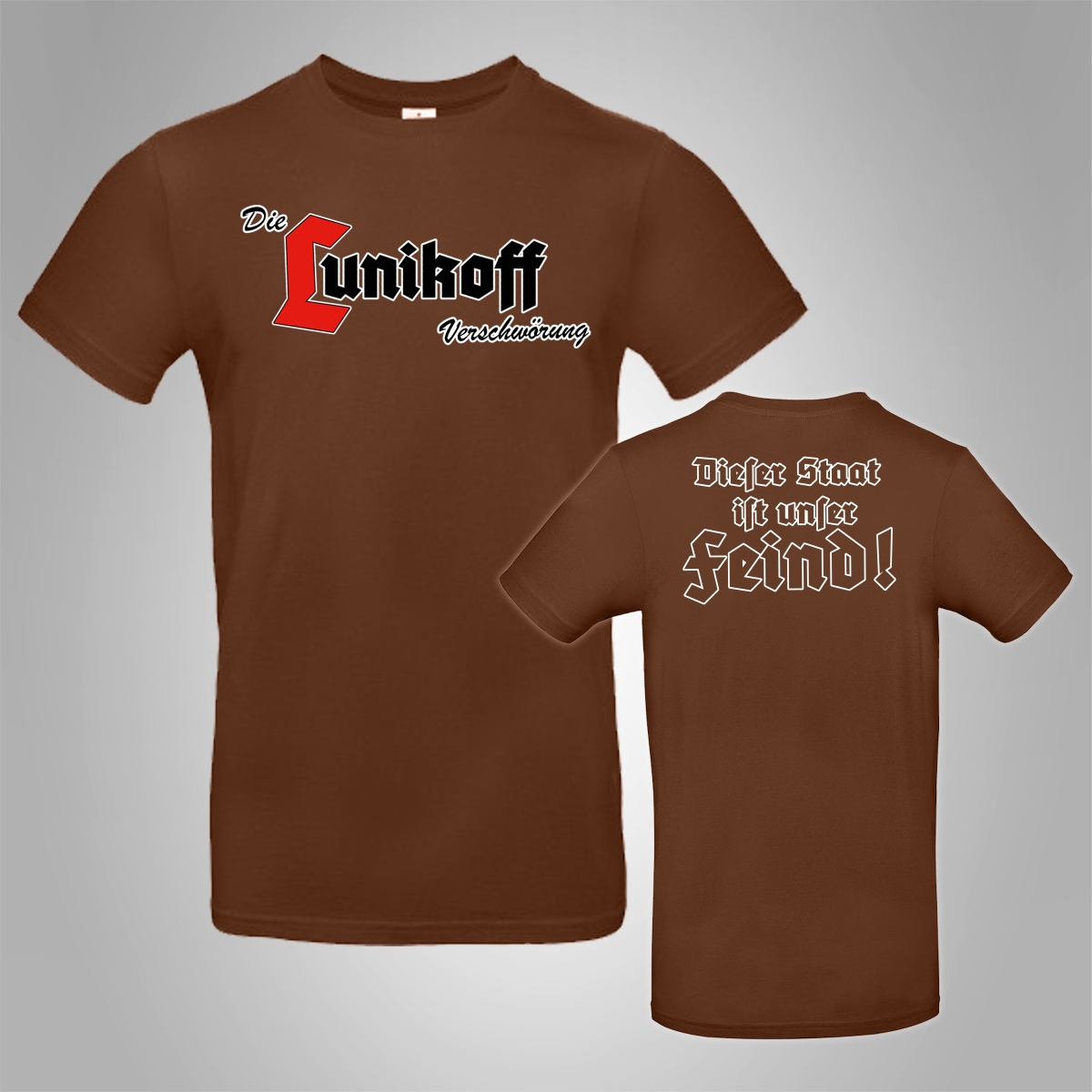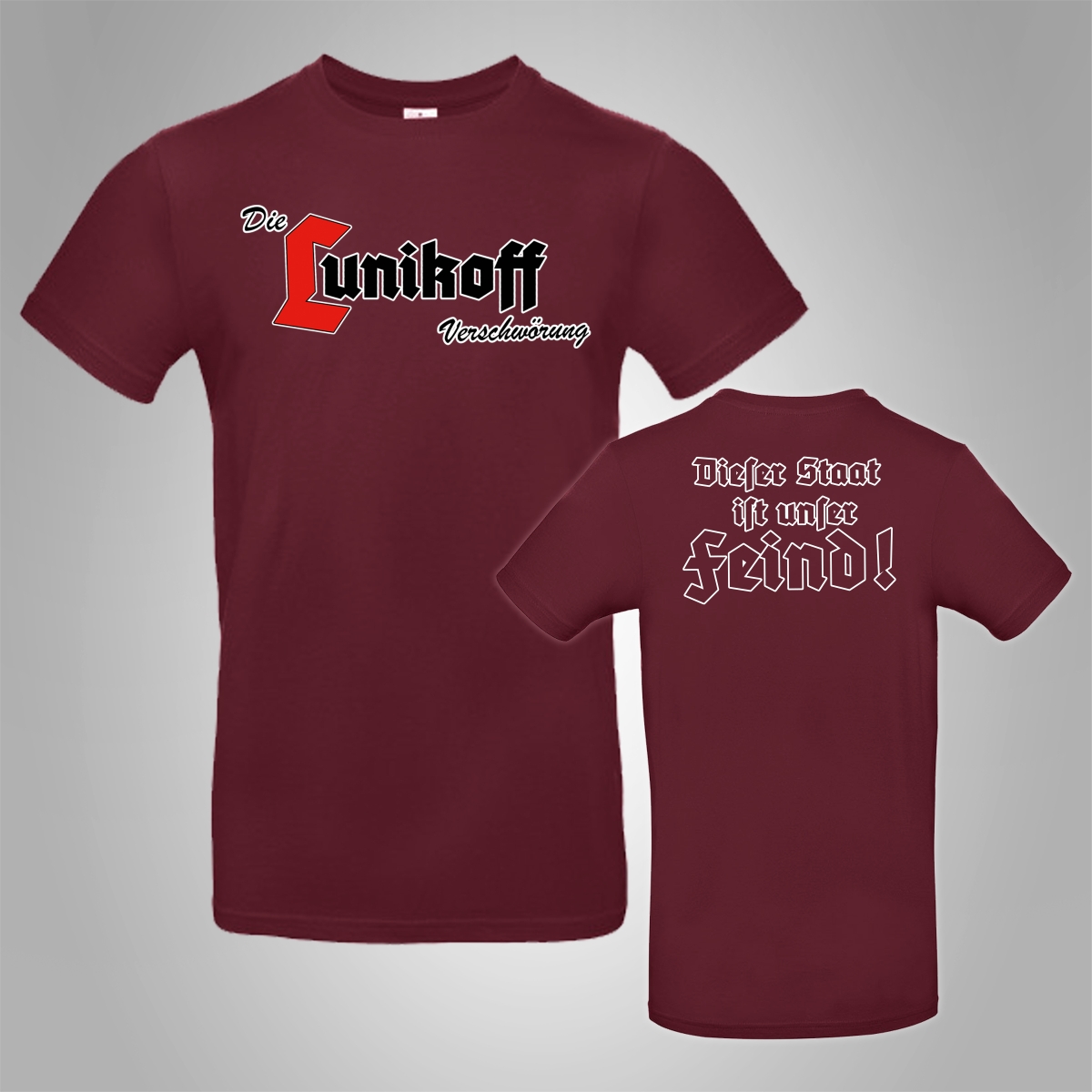 Shirt mit großen Verschwörung-Schriftzug welcher leicht schräg ist und großen Rückendruck